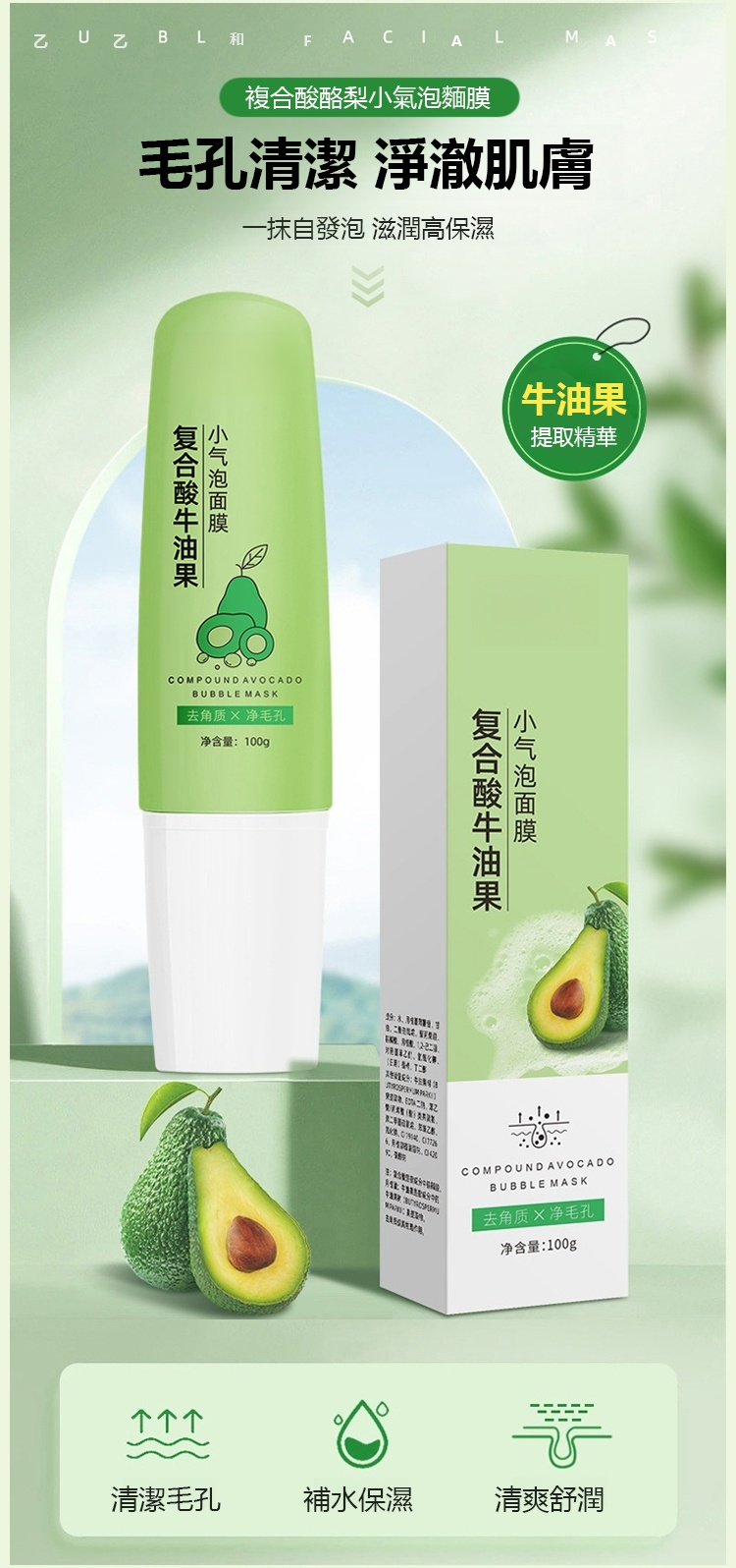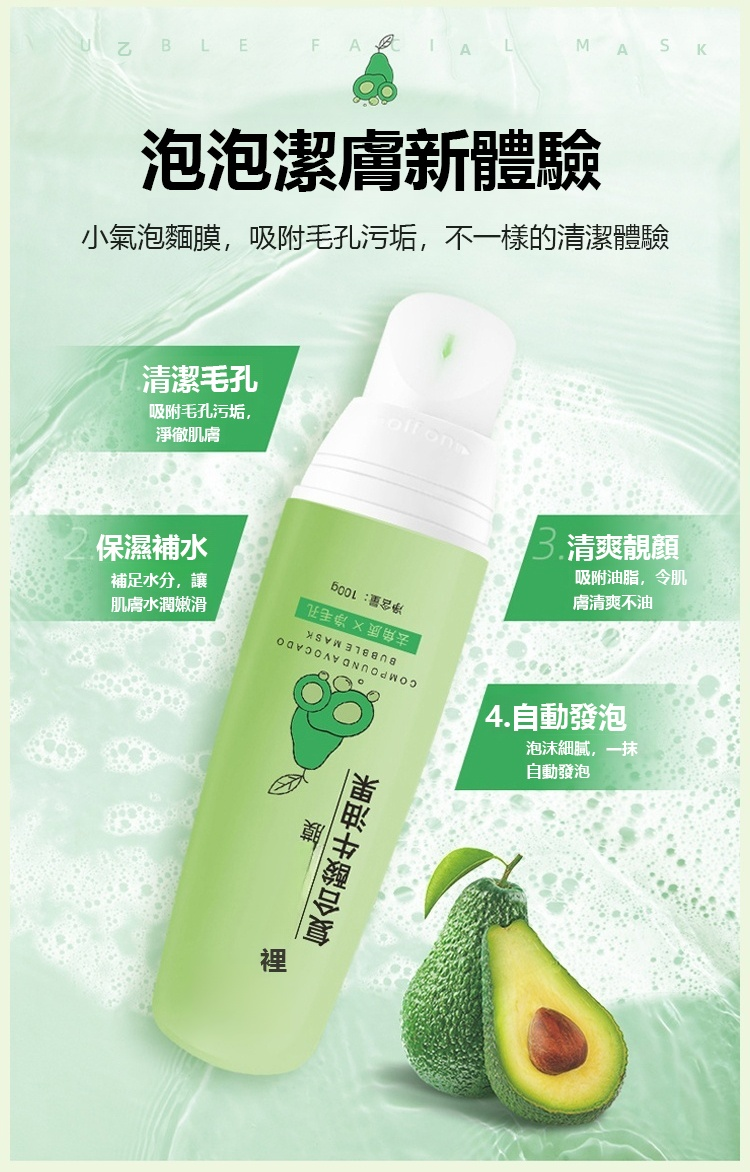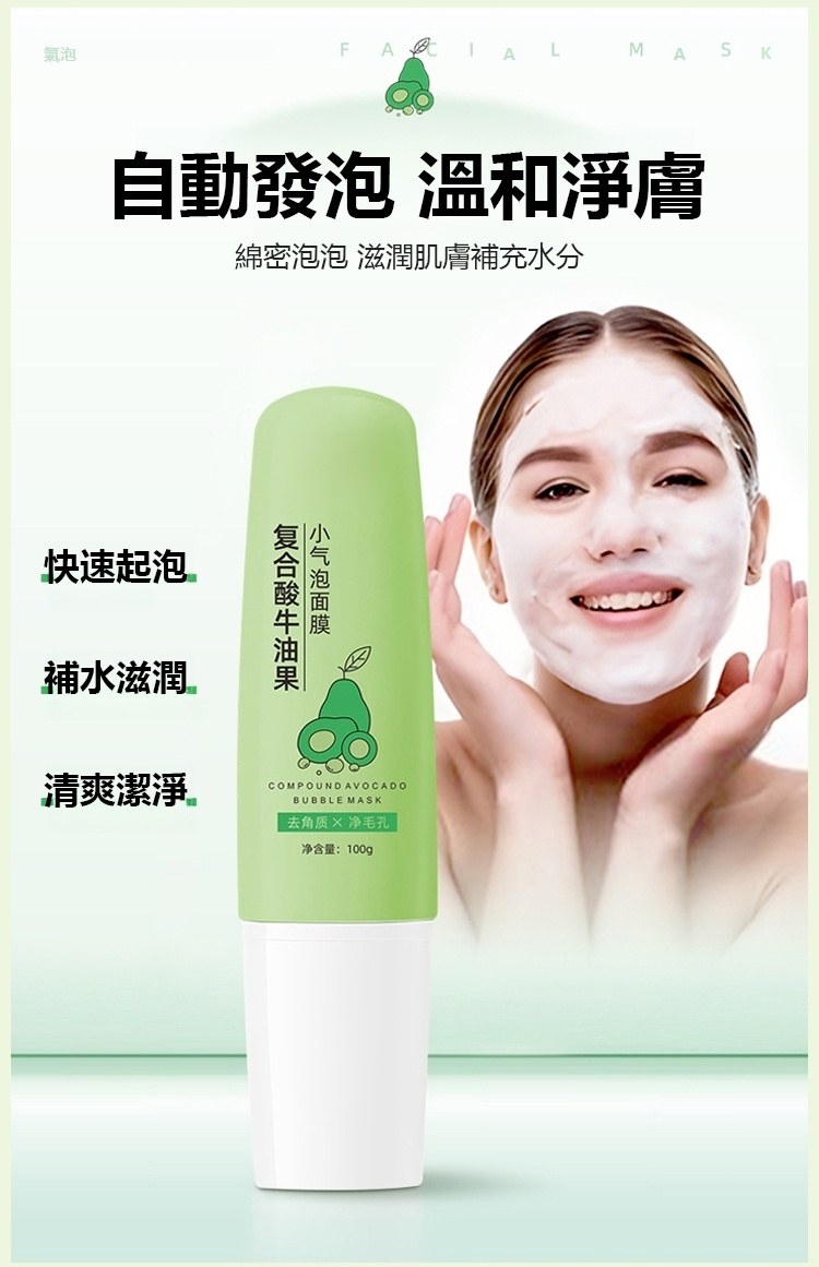 複合酸深層保濕保濕清潔毛孔酪梨小氣泡麵膜